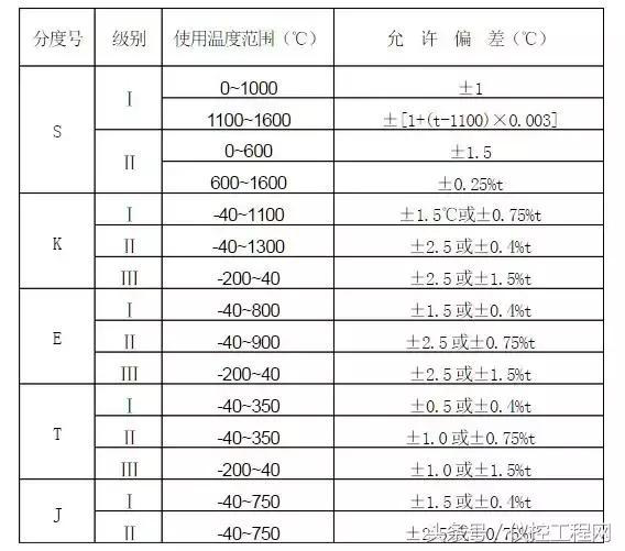 注:① t為被測溫度; ②允許偏差以℃或?qū)嶋H溫度的百分?jǐn)?shù)表示,應(yīng)采用其中計(jì)算數(shù)值較大的值(分度號為S的熱電偶除外)。